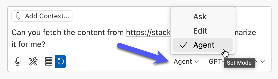 VS Code Copilot agent mode selectionVS Code Copilot agent mode selection